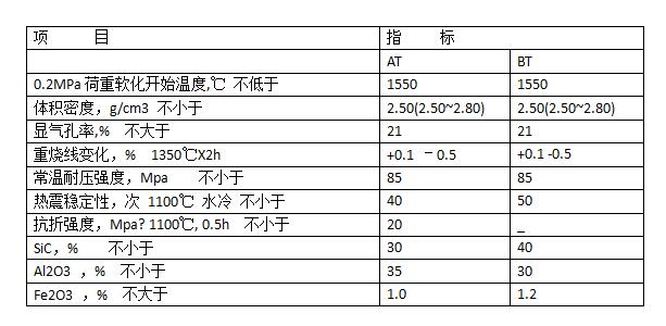 AT,BT莫來石-炭化硅磚的主要理化指標