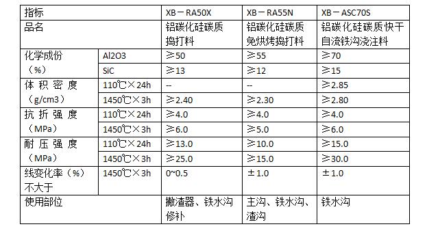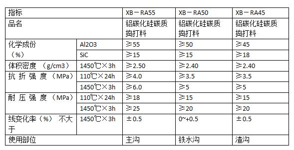產(chǎn)品用途及特點: 適用于中小型高爐出鐵溝以及大型高爐修補,具有施工性能好、強度大、不粘渣鐵、耐侵蝕、耐沖刷、高溫強度大等特點。理化指標見表一、表二。